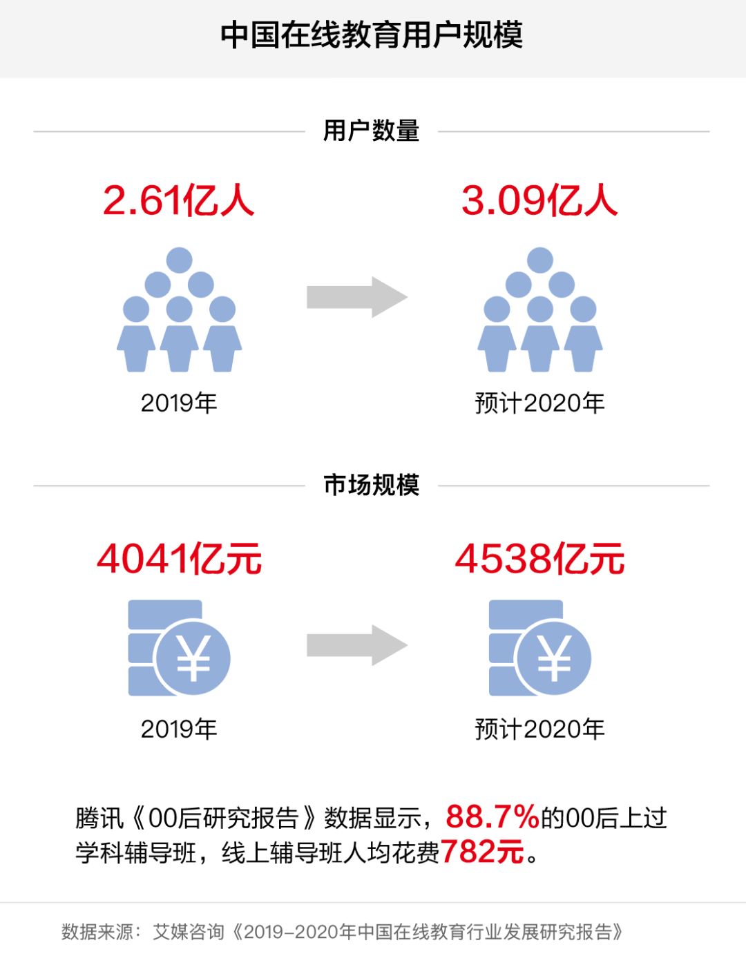 據(jù)艾傳媒咨詢《2019-2020中國在線教育產(chǎn)業(yè)發(fā)展研究報(bào)告》顯示,2019年中國在線教育用戶規(guī)模達(dá)到2.61億,市場(chǎng)規(guī)模達(dá)到4041億元。預(yù)計(jì)2020年中國在線教育用戶規(guī)模將達(dá)到3.09億。市場(chǎng)規(guī)模將達(dá)到4538億元,同比增長(zhǎng)15.5%;騰訊《00后研究報(bào)告》顯示,88.7%的00后學(xué)生參加過學(xué)科輔導(dǎo)班,在線輔導(dǎo)班平均費(fèi)用為782元。