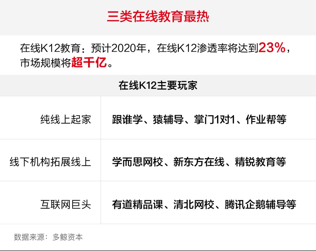 隨著升學(xué)競(jìng)爭(zhēng)的長(zhǎng)期存在,K12課外輔導(dǎo)已經(jīng)成為不可動(dòng)搖的需要。多鯨資本數(shù)據(jù)顯示,截至2018年,國內(nèi)K12學(xué)生人數(shù)超過1.74億,相應(yīng)的K12課外輔導(dǎo)市場(chǎng)超過4000億元。傳統(tǒng)教育機(jī)構(gòu)、互聯(lián)網(wǎng)巨頭、互聯(lián)網(wǎng)團(tuán)隊(duì)等不同背景的創(chuàng)業(yè)者紛紛涌入,以英語、數(shù)學(xué)為主。其中優(yōu)質(zhì)項(xiàng)目吸金能力強(qiáng),紅杉中國、GGV、IDG等一線資本均完成布局。過去一年,在線k12企業(yè)融資金額最高的是“一對(duì)一”E輪融資,融資金額3.5億美元;其次是“小盒子科技”1.5億美元的D輪融資。